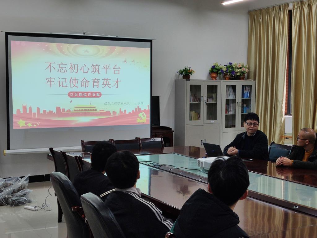 首先,建筑工程学院院长王珍吾在会上讲了主题为《不忘初心筑平台 牢记使命育英才》的专题党课。他以共产党人初心和使命是什么为切入点,详细讲解了作为一名普通党员,学院的领导干部,怎样做才能立足岗位,更好地不忘初心,为学院发展作贡献。