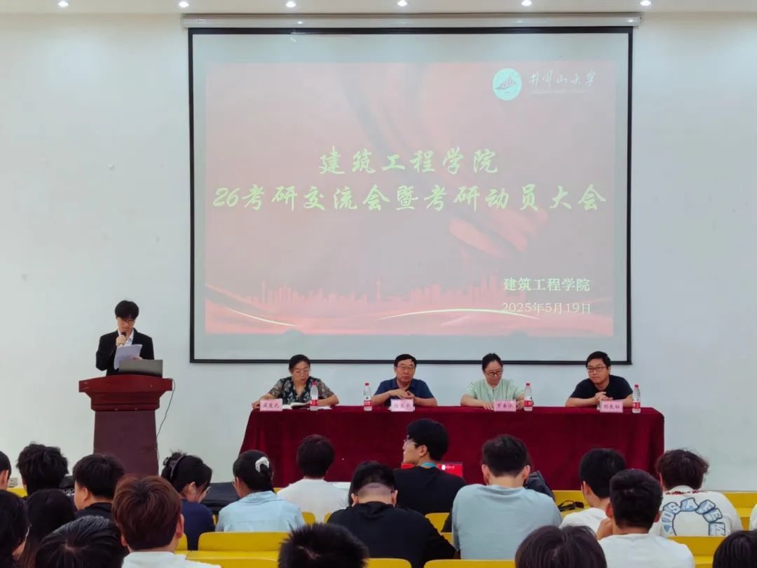 2025年5月19日上午十点,建筑工程学院在11栋报告厅隆重举行2026届考研交流会暨考研动员大会。学院党委书记陈京平、院长罗春泳、副院长梁爱民、刘良林、团委负责人王政凯出席,各专业负责人及2022级全体学生参加了本次会议。会议由学习部工作人员主持。