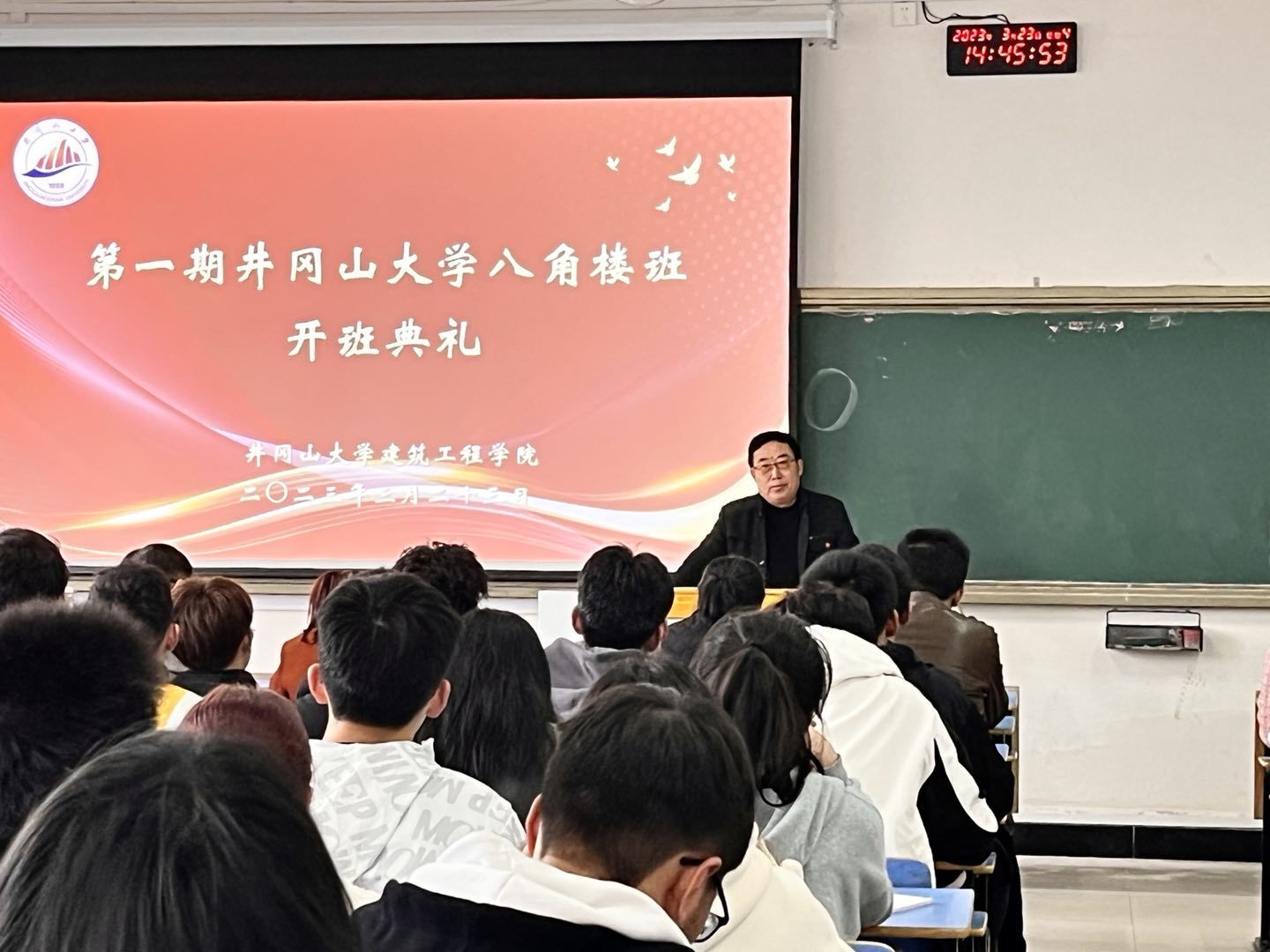 为进一步加强和改进大学生思想政治教育,落实立德树人根本任务,更好地将井冈山红色资源优势转化为办学优势,传承红色基因。3月23日下午,建筑工程学院在11栋教学楼A303举办“八角楼班”开班典礼。学院全体党政领导、辅导员和八角楼班全体学员共计70余人参加开班典礼。开班典礼在国歌声中拉开序幕。学院党委副书记、带班辅导员刘新明介绍了班级培养目标、规划及考核细则,党员学生刘浩东代表学员作表态发言。党委书记陈京平向全体学员提出期望和要求:一是认真对待,充分认识参加红色班级的重要意义;二是珍惜机会,增强学习自觉性,加强参加培训活动的积极性;三是严格要求,遵守规章制度,确保顺利毕业,力争学有所获,让“八角楼的灯光”照亮新的征程。