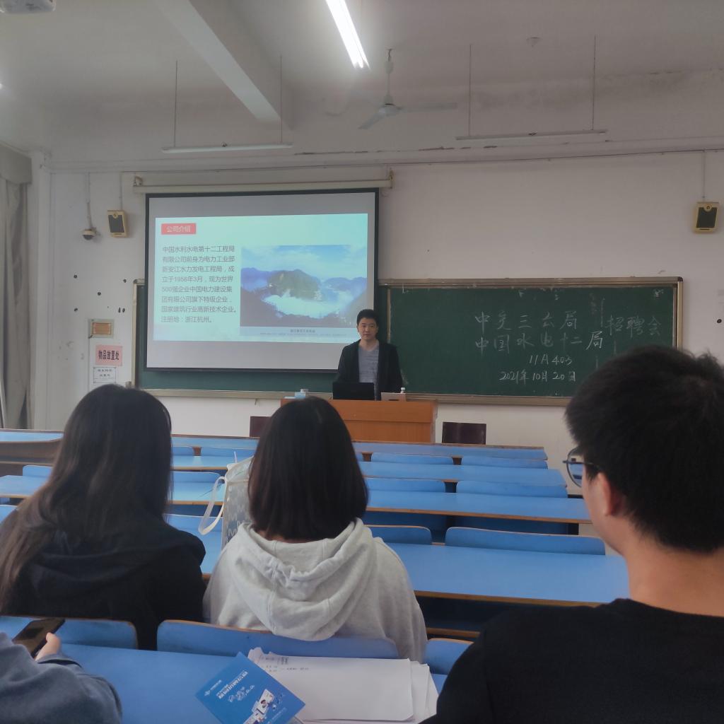 2021年10月20日上午11点,中国水利水电第十二工程局有限公司专场招聘会在11A403召开,我院18土木工程1、2班和土木国际班3个班全体学生参加。
