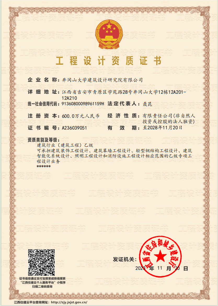 井冈山大学建筑设计研究院自2014年4月成立以来,在学校的领导下,得到了建筑工程学院、资产经营公司以及其他相关部门的大力支持,经过多年努力,于2023年11月20日成功获批建筑行业(建筑工程)专业乙级资质。资质的获批将提升设计院对外服务能力,扩大社会影响力。同时,为提高我校人才培养质量、加大“双师双能”型教师培育力度,探索产教融合模式,提供了实践教学科研平台。