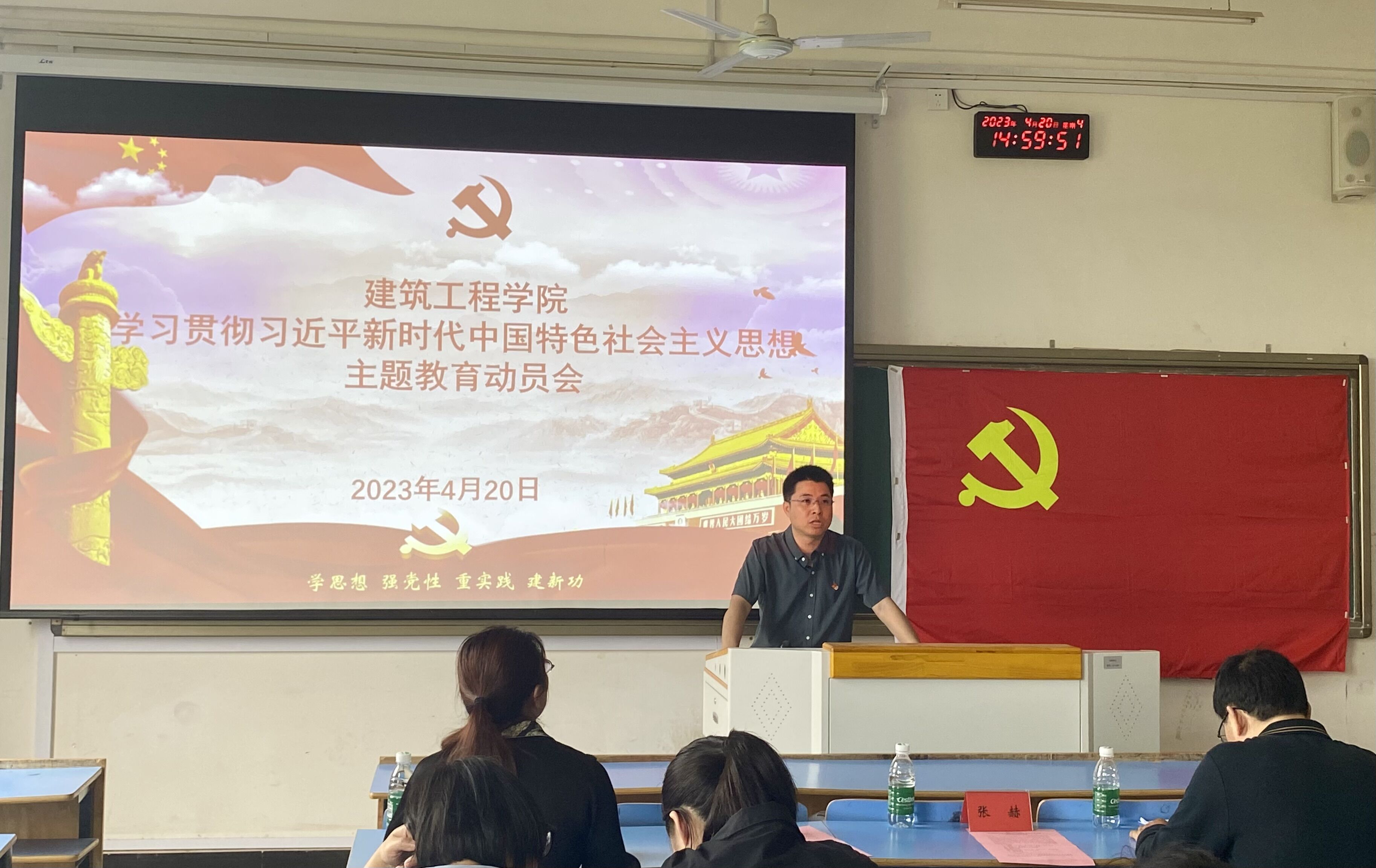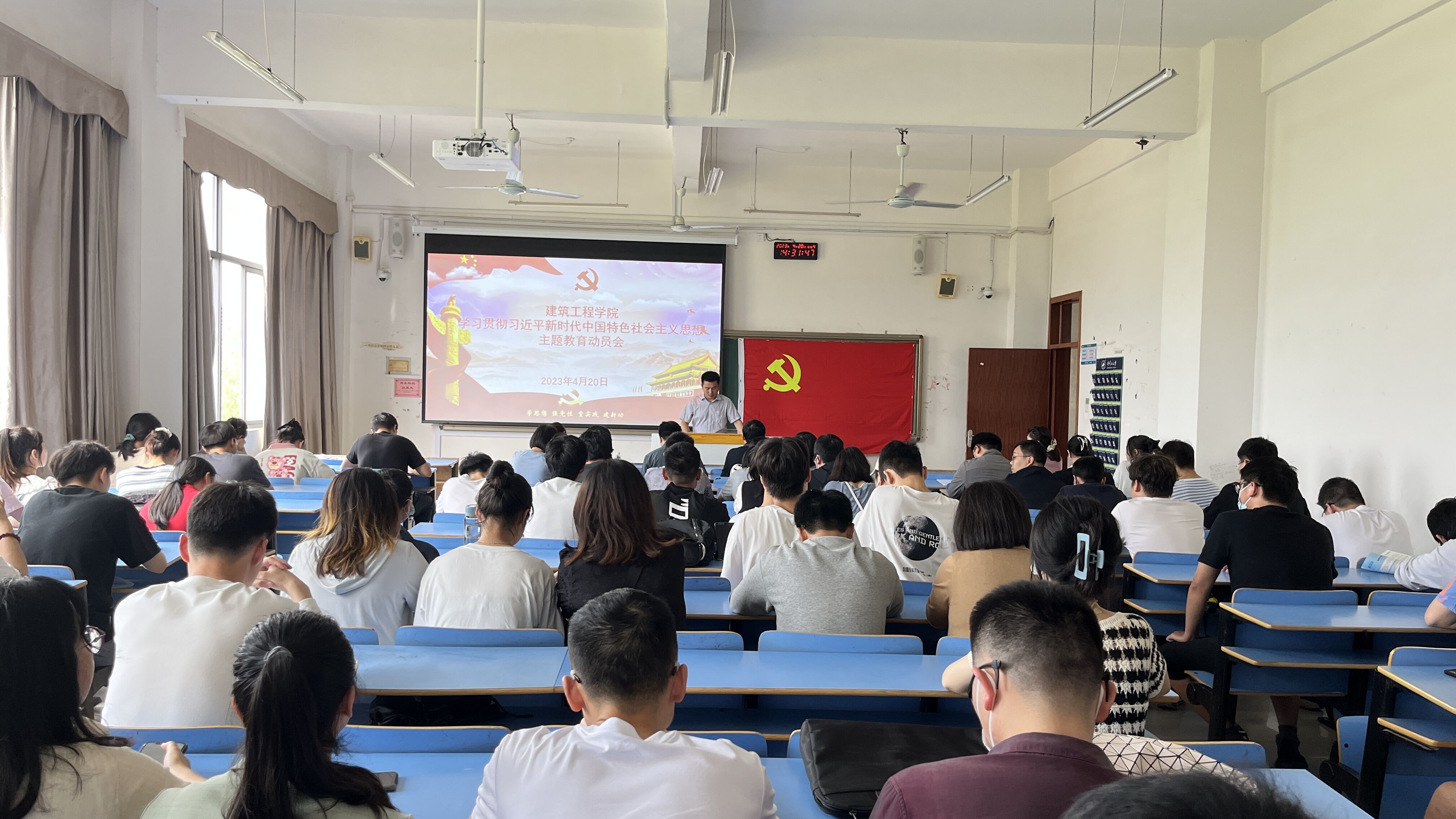 为教育引导广大党员、干部深入学习贯彻习近平新时代中国特色社会主义思想,建筑工程学院于4月20日下午召开学习贯彻习近平新时代中国特色社会主义思想主题教育动员大会。联系学院校领导、校长助理张赫教授与会指导,学院全体班子成员、各支部书记、全体党员、师生代表共计100余人参会,党委副书记刘新明主持会议。校长助理张赫在会上作指导讲话。认为建筑工程学院对主题教育活动高度重视,认真准备,精心谋划,体现了学院党委对主题教育的各项要求。同时,他结合学校实际工作,从提升政治站位、把握总体要求、聚焦根本任务、锚定具体目标、贯通重点措施等五个方面提出了意见和要求,为学院开展好主题教育提出了具体的指导。
