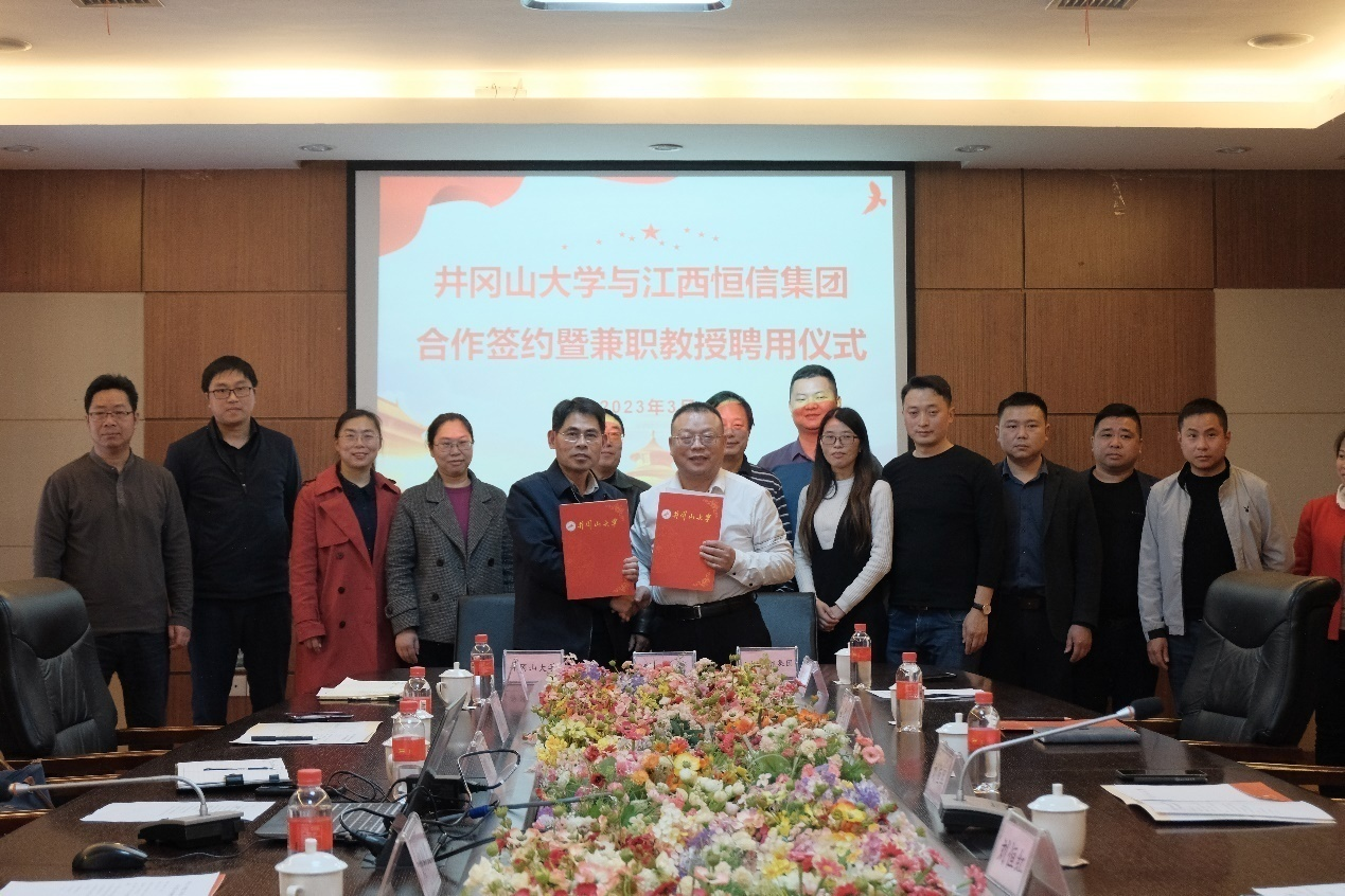 为深入贯彻落实党的二十大精神,进一步加强校企合作,推动产学研深度融合,3月15日,井冈山大学与江西恒信检测集团有限公司举行产学研合作签约暨兼职教授聘任仪式。井冈山大学党委常委、副校长刘利民、江西恒信检测集团有限公司董事长刘恒军出席并讲话,江西恒信检测集团有限公司总裁刘恒红、江西赣信工程检测有限公司总经理李星陵等公司高管、建筑工程学院党政领导班子及各教研室骨干教师参加仪式。井冈山大学党委常委、副校长刘利民代表学校签约,并向刘恒军、刘恒红颁发了学校兼职教授聘书。