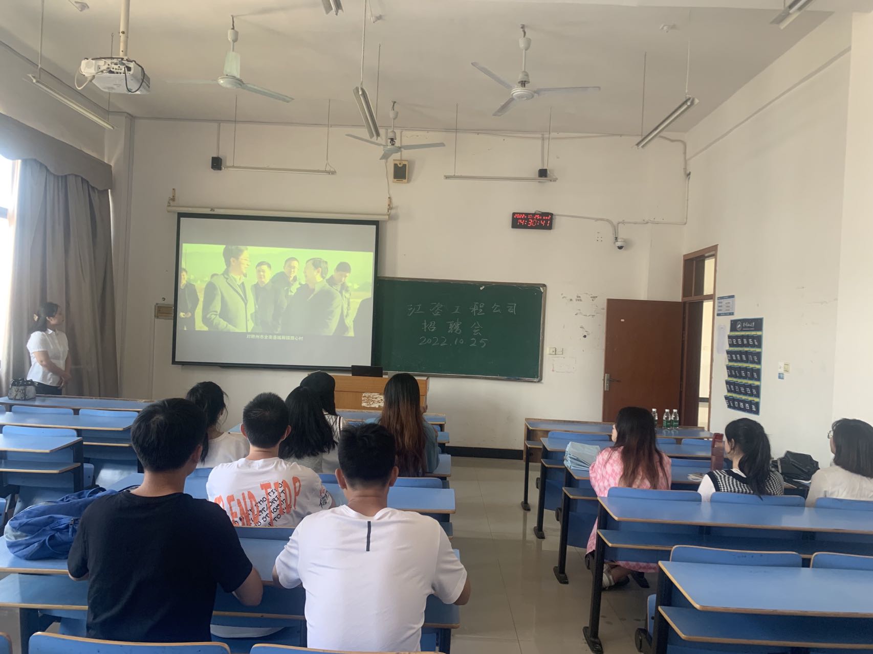 公司总经理助理肖慧萍结合公司宣传片和自身成长经历,对现场学生进行宣讲,让学生全面认识公司发展历程、发展前景、福利待遇,还将目前承担的项目也向学生进行了详细介绍,希望有志于加入毕业生,可以提前确定实习意向,就近安排到学校周边项目上实习。