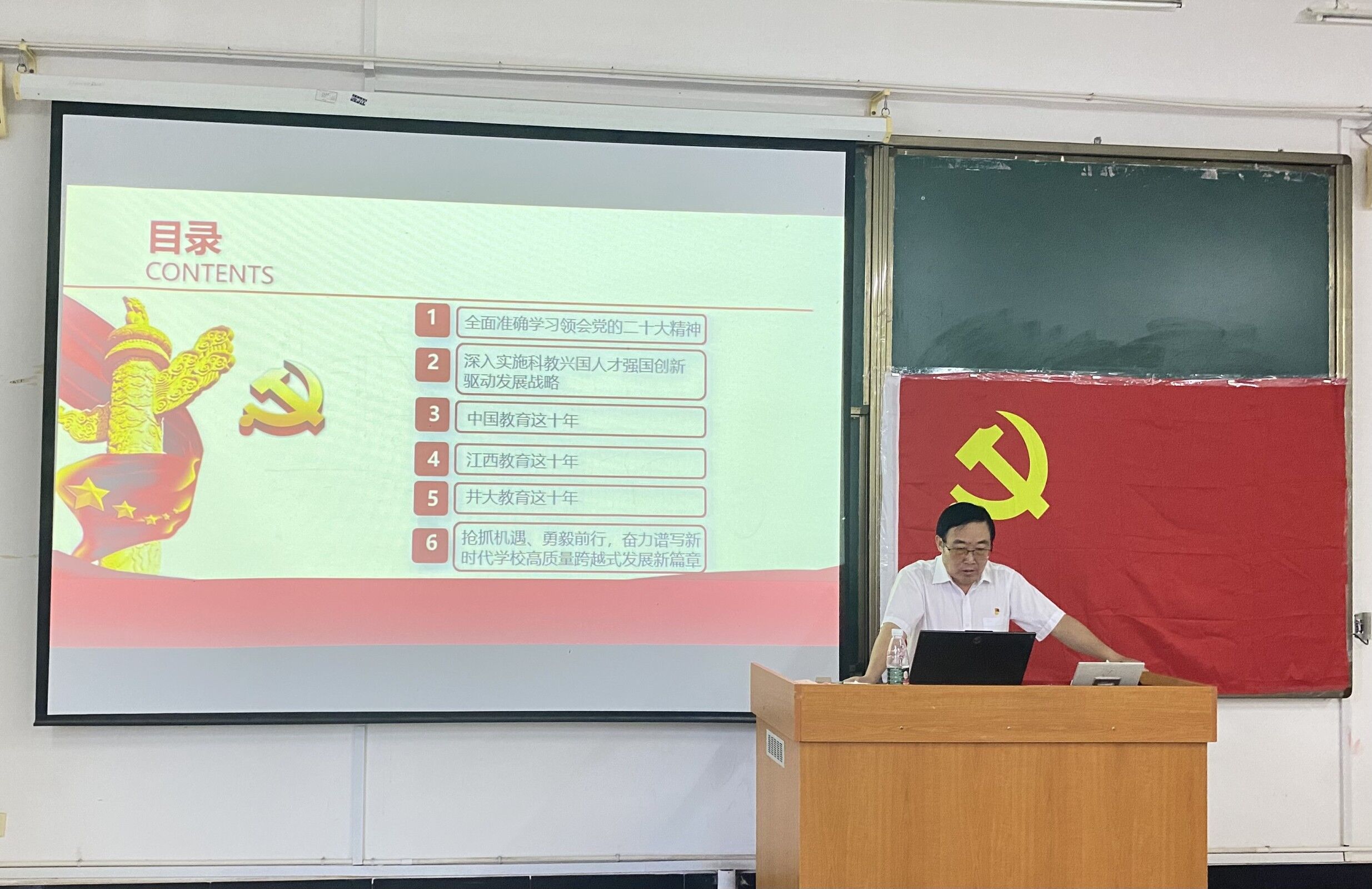 宣讲会上,陈京平全面解读了二十大召开的重大意义,帮助学生党员和入党积极分子及全院教职工深入理解内涵,精准把握外延。他结合高校教育和青年工作,讲解了深入实施科教兴国人才强国创新驱动发展战略的意义,系统地分析了中国教育、江西教育在科教兴国战略政策下十年间的变化,并结合本校情况,阐述了井冈山大学在教育政策驱动下十年间的成效。