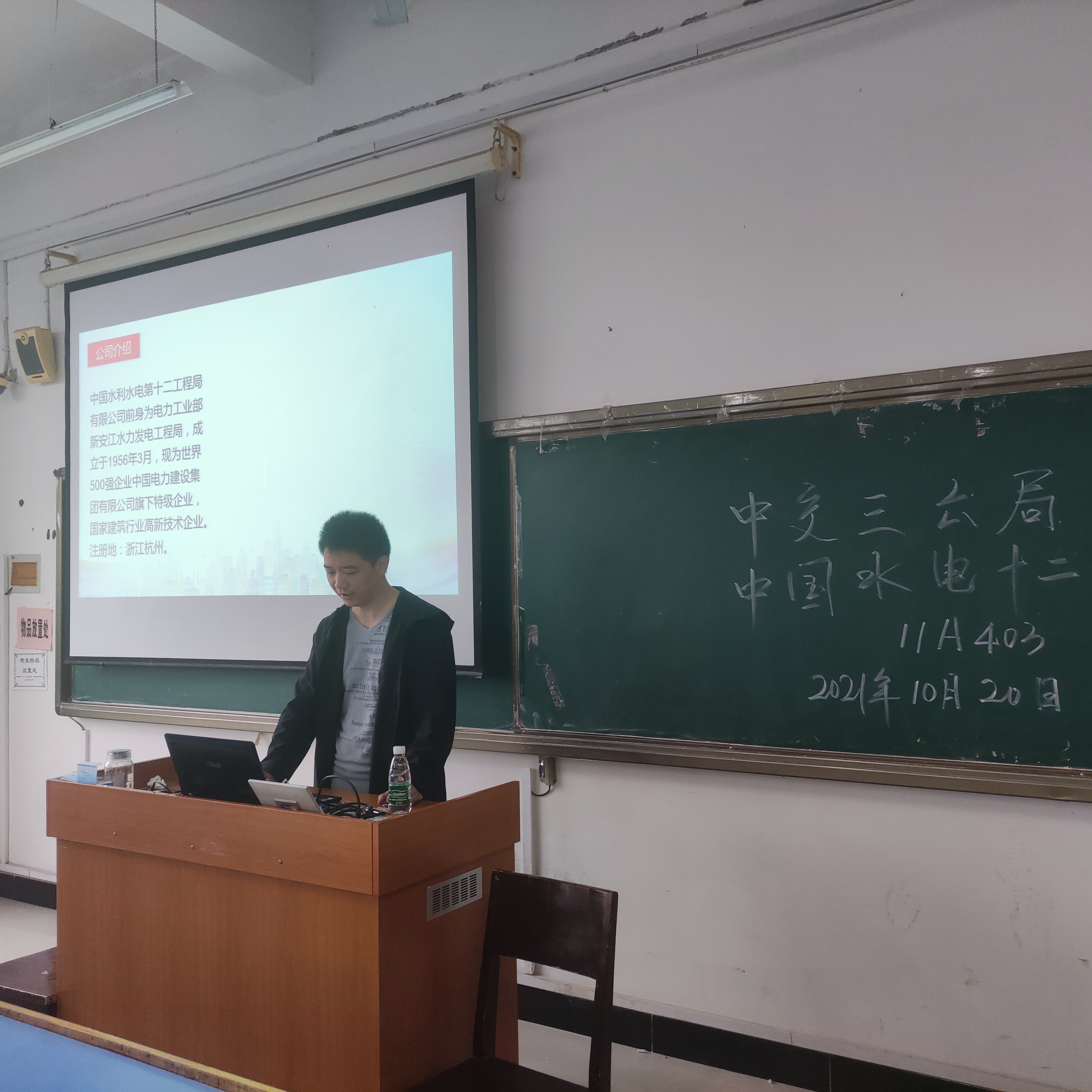 2021年10月20日上午11点,中国水利水电第十二工程局有限公司专场招聘会在11A403召开,我院18土木工程1、2班和土木国际班3个班全体学生参加。