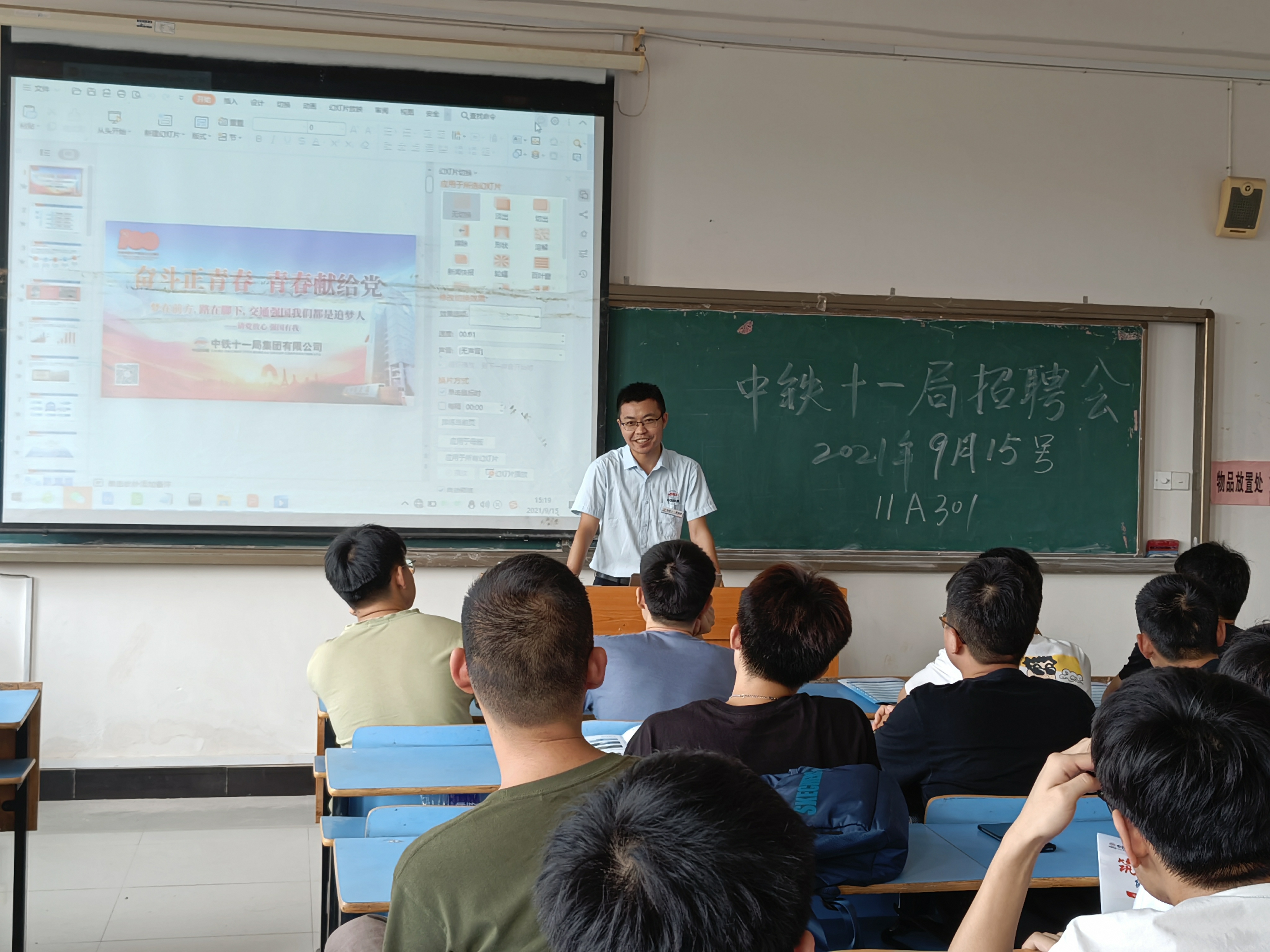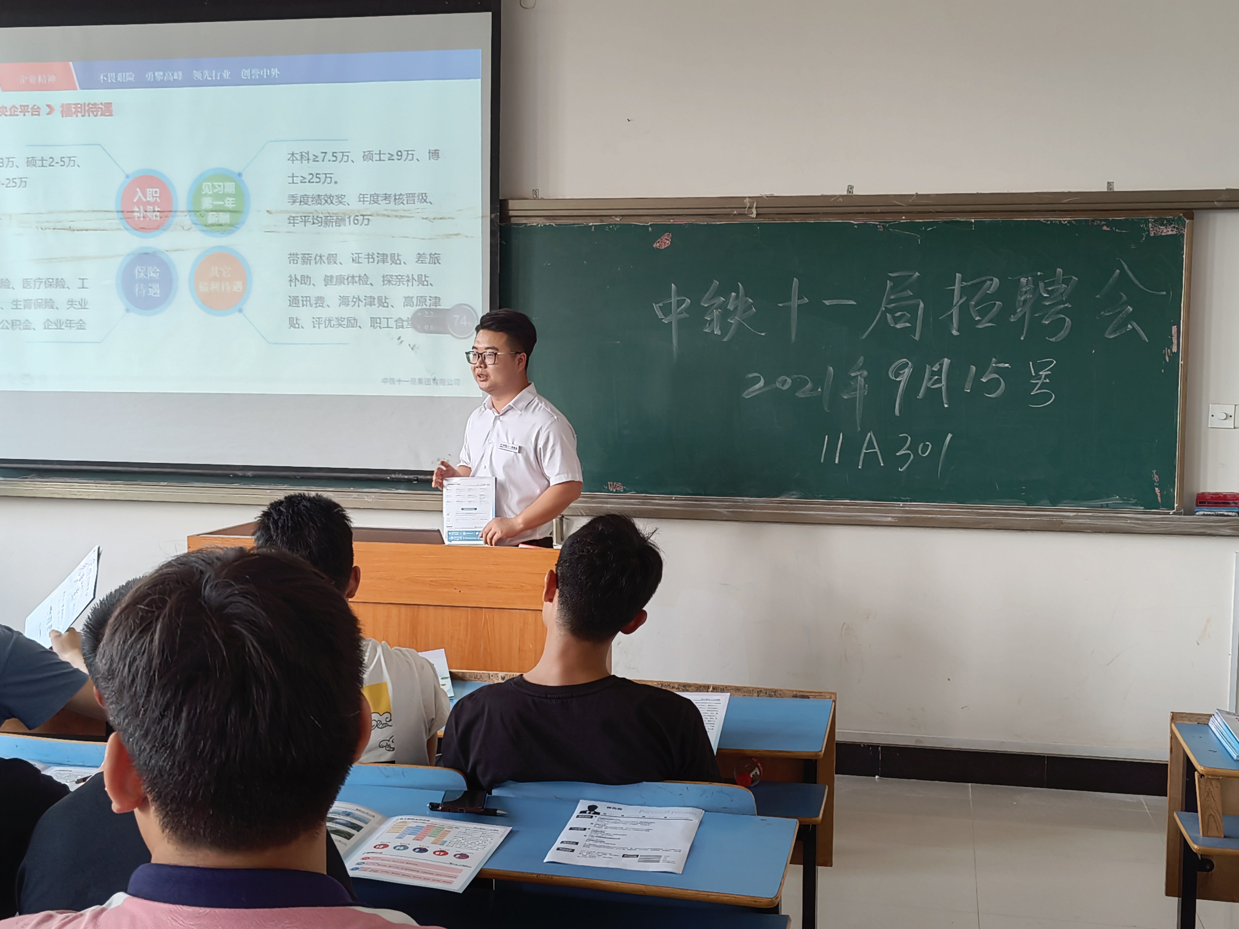 2021年9月15日下午两点在11栋A301教室,建筑工程学院召开了中铁十一局集团有限公司专场招聘会。来自我院相关专业的应届毕业生参加了招聘会并投递了简历.