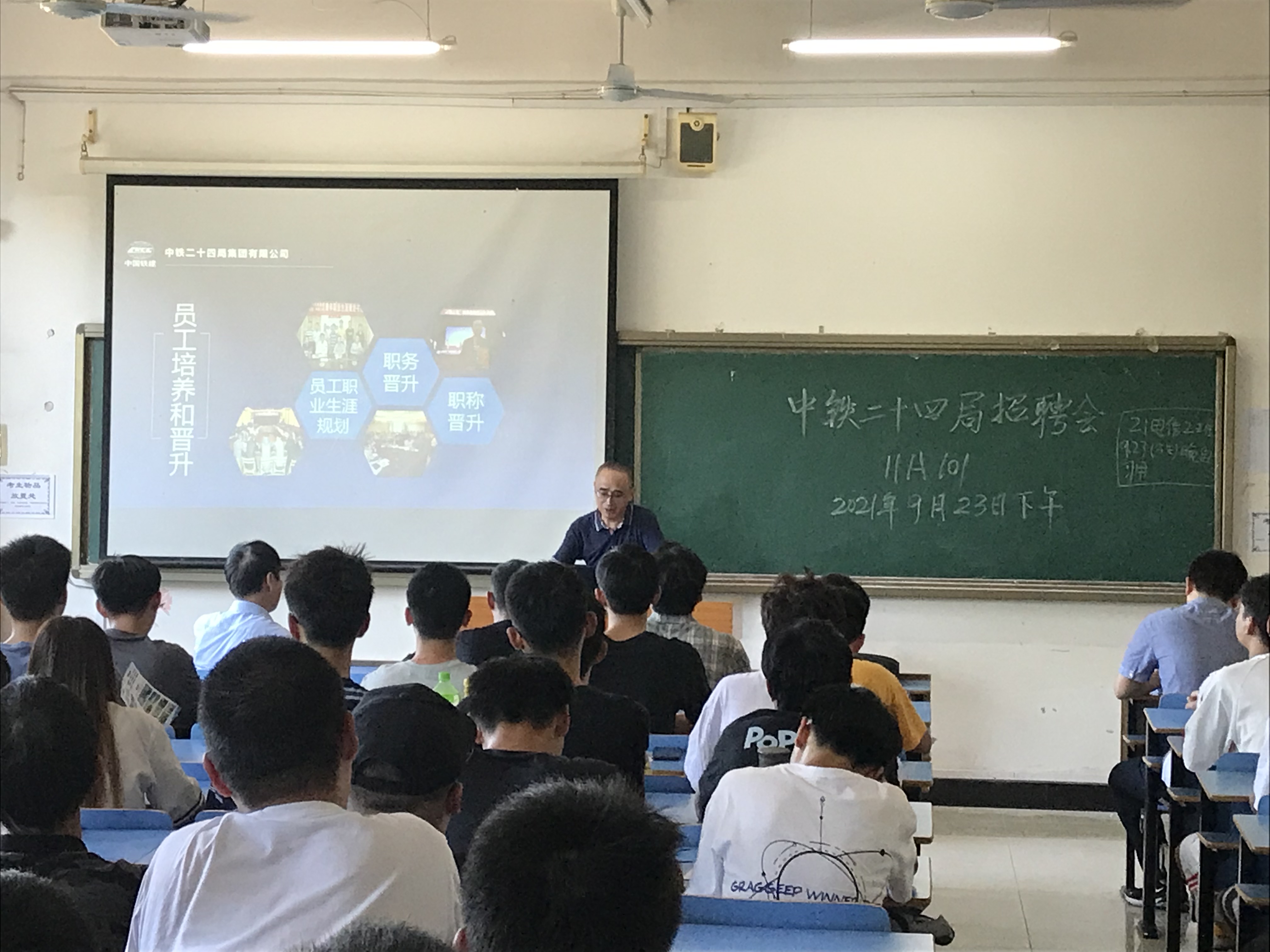 2021年9月23日(星期四)下午2点30分,中铁二十四局集团有限公司下属的上海工程有限公司、上海轨道工程有限公司、南昌铁路工程公司、桥梁建设公司等4家企业到我院召开现场招聘会,我院2022届毕业生参加了招聘会。