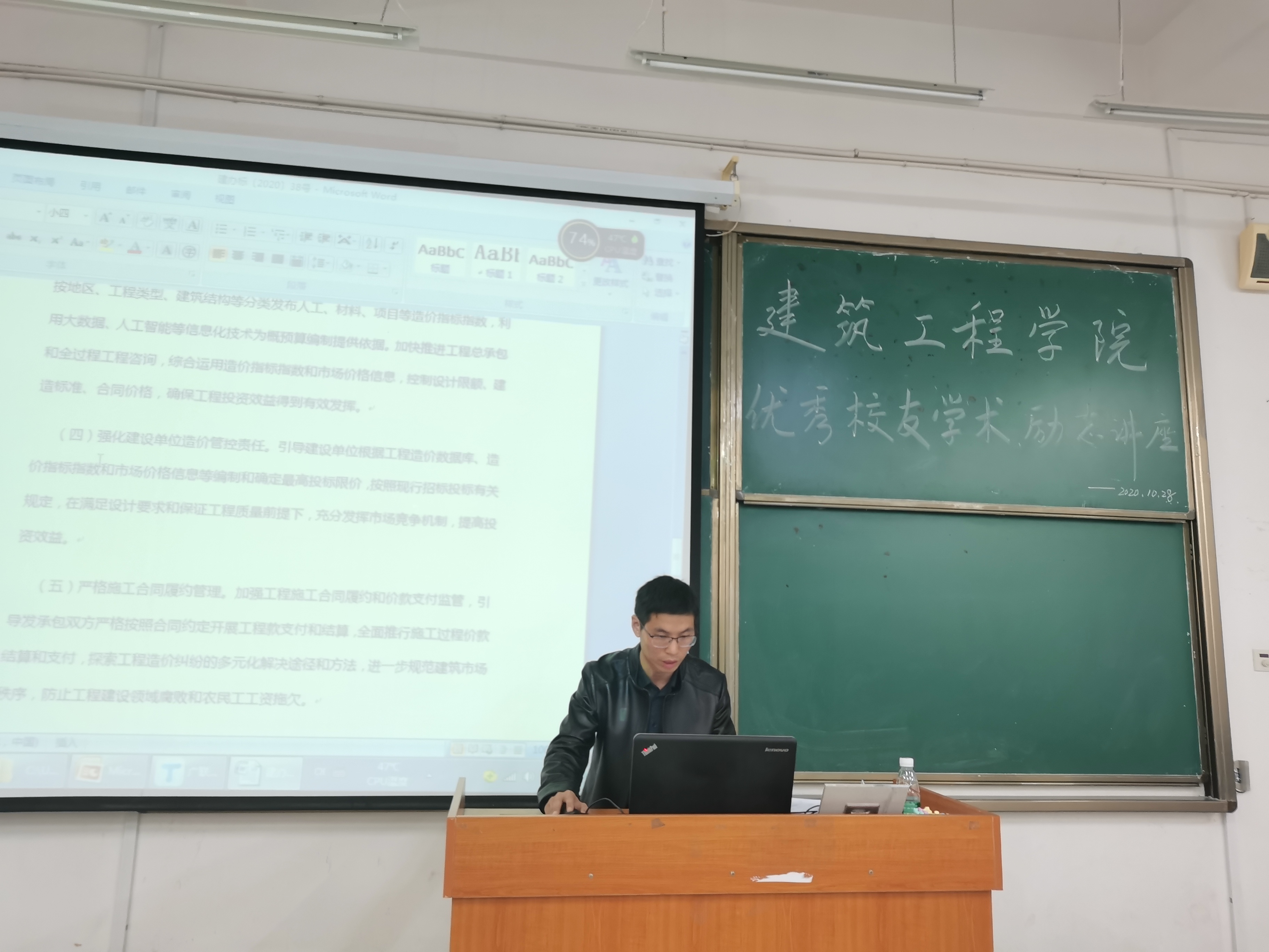 在这个充满浓厚校庆氛围的日子里,为庆祝井大建校62周年,同时给学院学生提供专业上的指导,井冈山大学建筑工程学院在11栋B104举办了优秀校友学术、励志讲座。本次活动学院盛情邀请了井大优秀校友、江西省安信造价咨询有限公司总工程师、08级工程管理专业吴利成同学为学院工程管理专业学生开展学术、励志讲座。18工管1班、18工管2班、19工管1班、20工管1班全体同学到场聆听了本次讲座。 多年寒暑,走过风雨历程;千万学子,育出栋梁之材。优秀校友谨记母校教诲,希望在座的每一位学子不忘初心、砥砺前行,为母校创造新成就与新辉煌。正所谓听君一席话,胜读十年书,校友吴利成的演讲绘声绘色,他的每一句话都囊括了重点,简洁而不轻浮,在座的每一位学生都听得很入迷,犹如一棵棵渴望吸收养分的小苗,期盼有朝一日也能成长为参天大树。