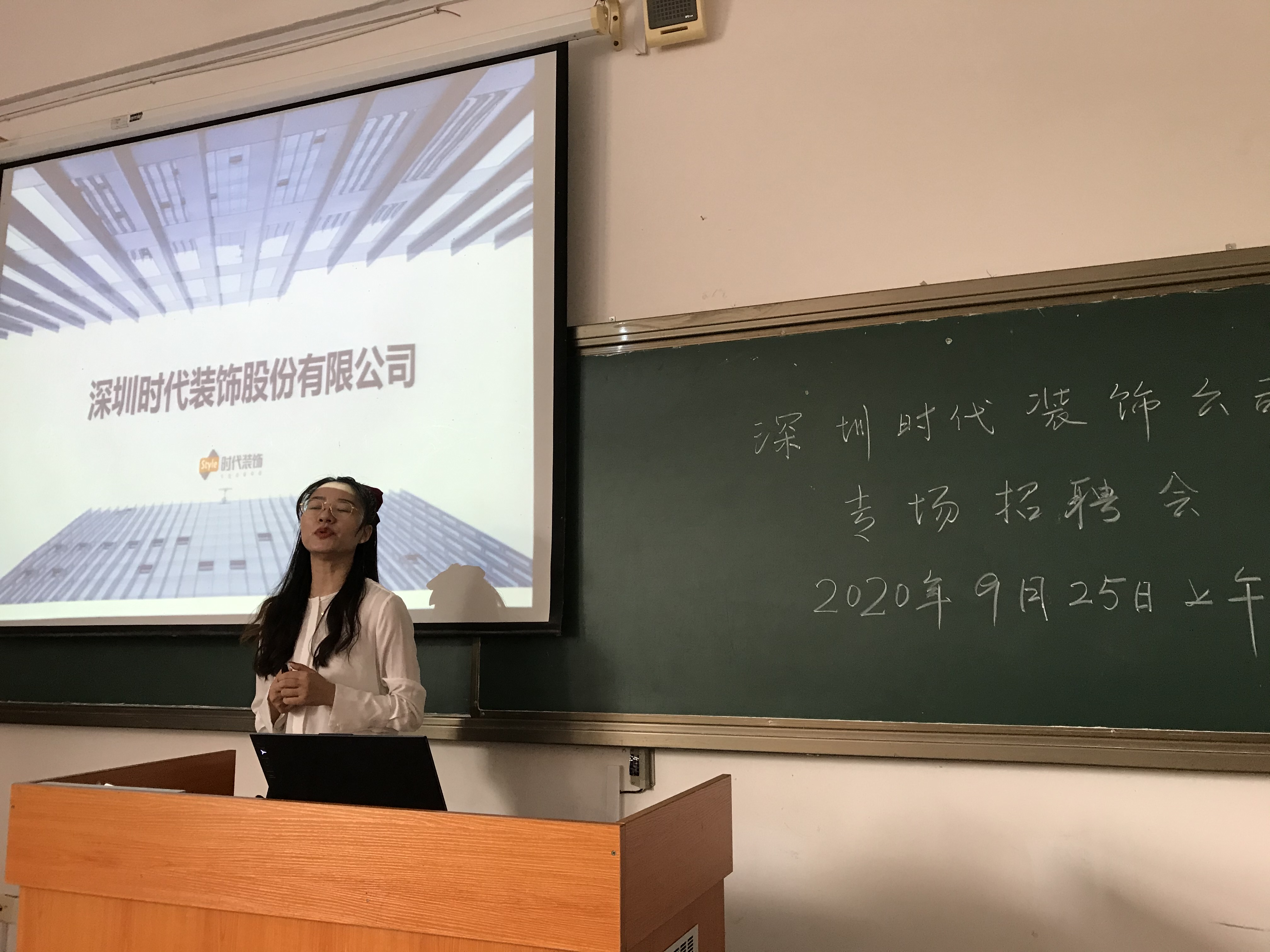 深圳时代装饰股份有限公司于2020年9月25日上午午10点11栋A103教室召开召开我院2021届毕业生现场招聘会,我院2021届毕业生参加了招聘会宣讲。