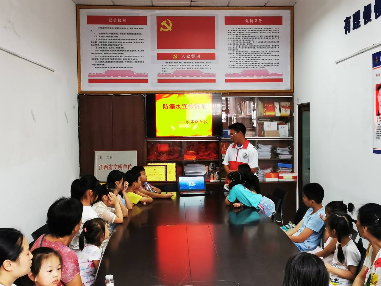 2020年7月31日,赣州志愿者来到章贡区东郊路社区新时代文明实践所给少年儿童进行防溺水宣讲和举办红色教育故事会。