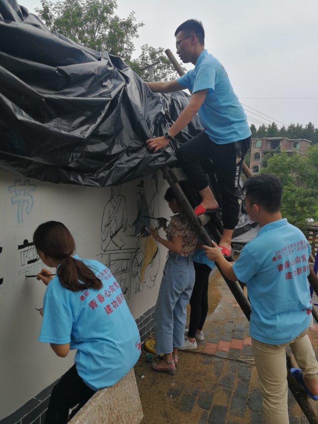 7月5日至9日,井冈山大学建筑工程学院“凝聚时代梦想,共筑魅力水南”大学生暑期社会实践服务团抵达吉水县水南镇曾狮岭村,开展了墙绘创作活动。实践团结合当地精神文化需求,将社会主义核心价值观、孝亲敬老文化、礼仪美德等元素融入墙绘,助力当地的民风建设。值得一提的是,实践服务团了解到当地村民以中老年人居多,为了适应中老年人的生理特征,体现人文关怀的精神,在设计墙绘时,选取中老年人喜闻乐见的图画,并配以鲜明的大字标语。连日来的暴雨给墙绘壁画活动带来重重困难,但实践服务团不畏艰辛,搭建雨布作画,此举引起了村民们的关注,大家纷纷驻足观看,更有热心村民上前帮助队员固定雨布。水南镇人大副主席兼团委书记杨慧娟多次到场参观、指导,并为实践服务团提供了便利的交通条件。
