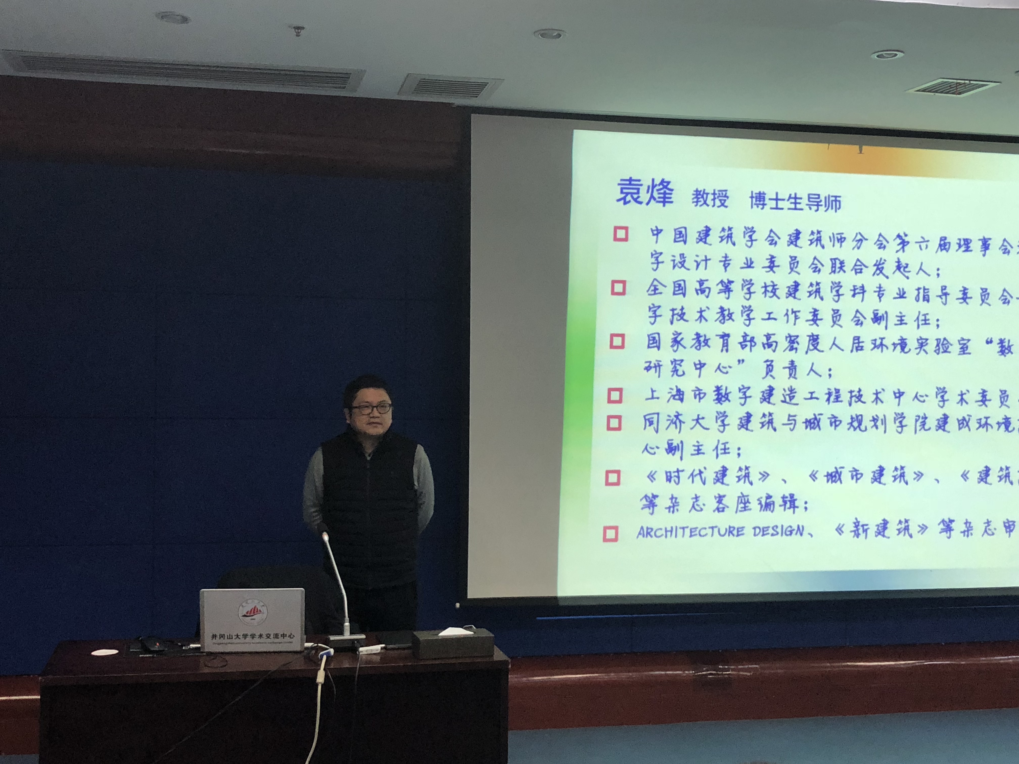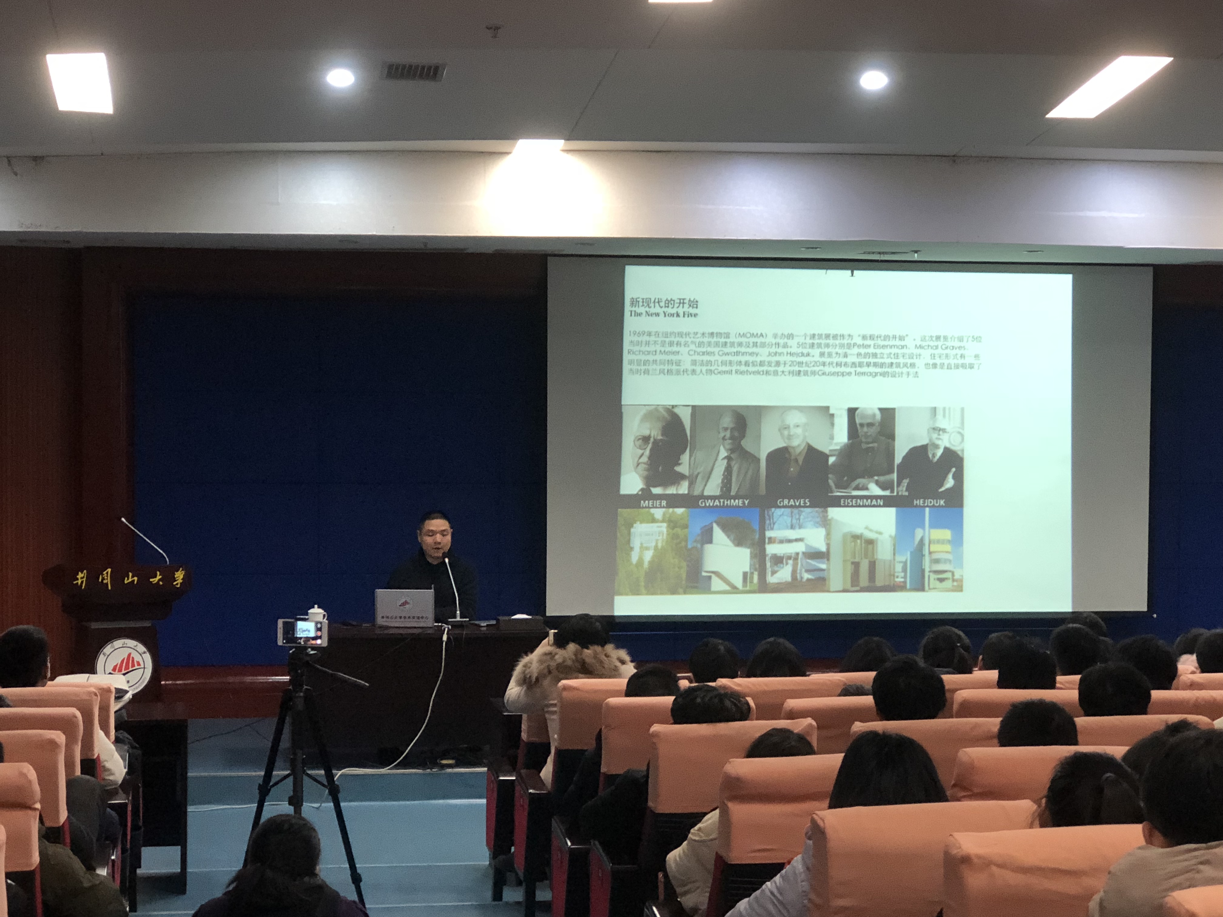 李翔宁教授报告的题目是《建筑展览:当代建筑文化的推进器》,他以时间为轴讲述了历史上对建筑影响较大的展览,其中包括了“魏森霍夫建筑展”、“空间中的城市”、现代主义建筑的“国际风格展览”、“这就是明天”等14个展览,还介绍了当代中国建筑的发展程度,让在场师生增长眼界。袁烽教授报告的题目是《数字化设计与智能建造》,他从后合理化、结构建筑师、结构找型等方面作阐述,着重介绍了一个四川农村建筑项目,通过数字化设计与智能建造的手段把传统的坡屋顶建筑进行了重构,展现出别出心裁的建成效果。他还以同济大学的建筑“机器人”为例,讲述了机器人的发展历程,并提出了“走向智能建造未来的十点建议”,给在场师生描绘了一幅未来智能建造的美丽图景。